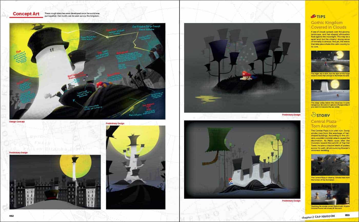 Certaines pages incluent également des commentaires et annotations de l’équipe de développement, offrant un éclairage intéressant sur les choix artistiques réalisés pendant la création du jeu. Le lecteur peut ainsi mieux comprendre la manière dont les idées visuelles ont été développées pour construire l’univers de Super Mario Odyssey.