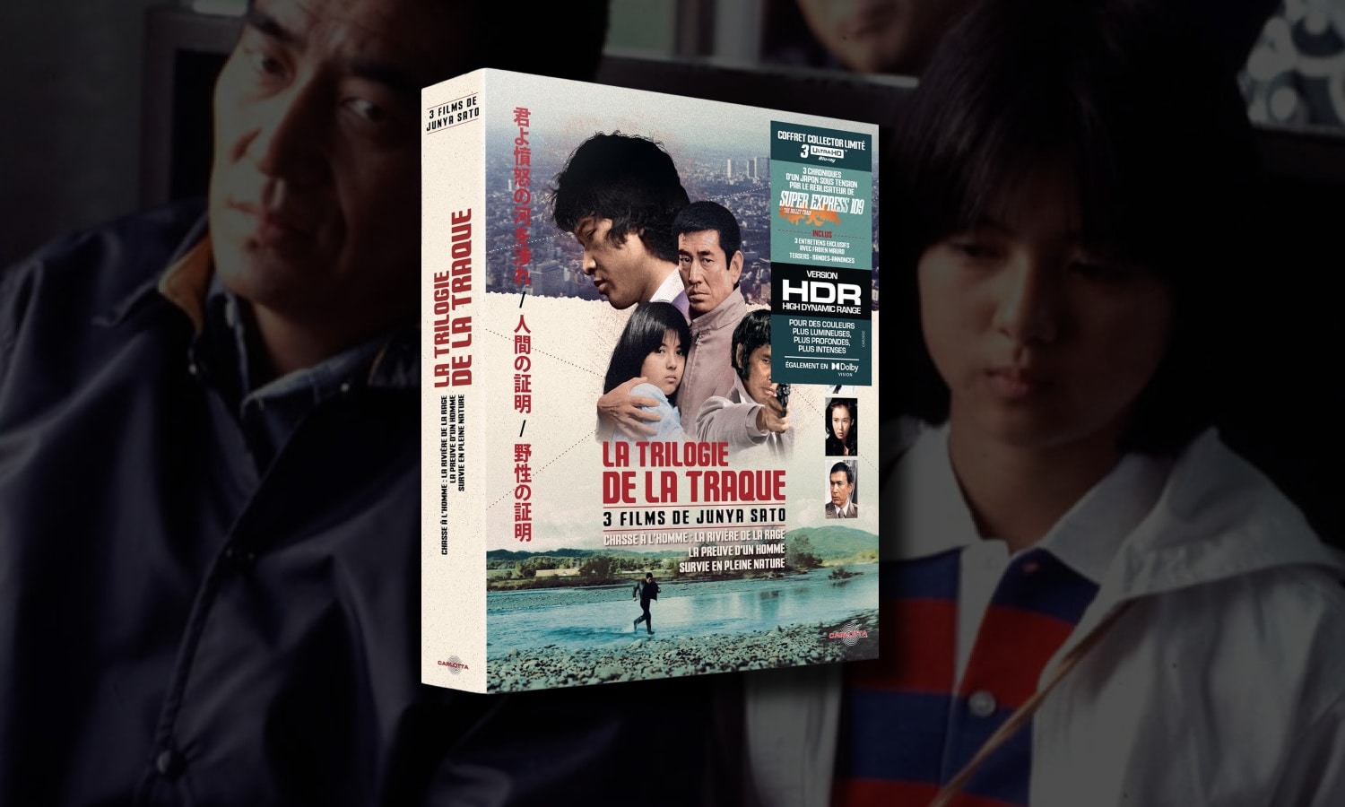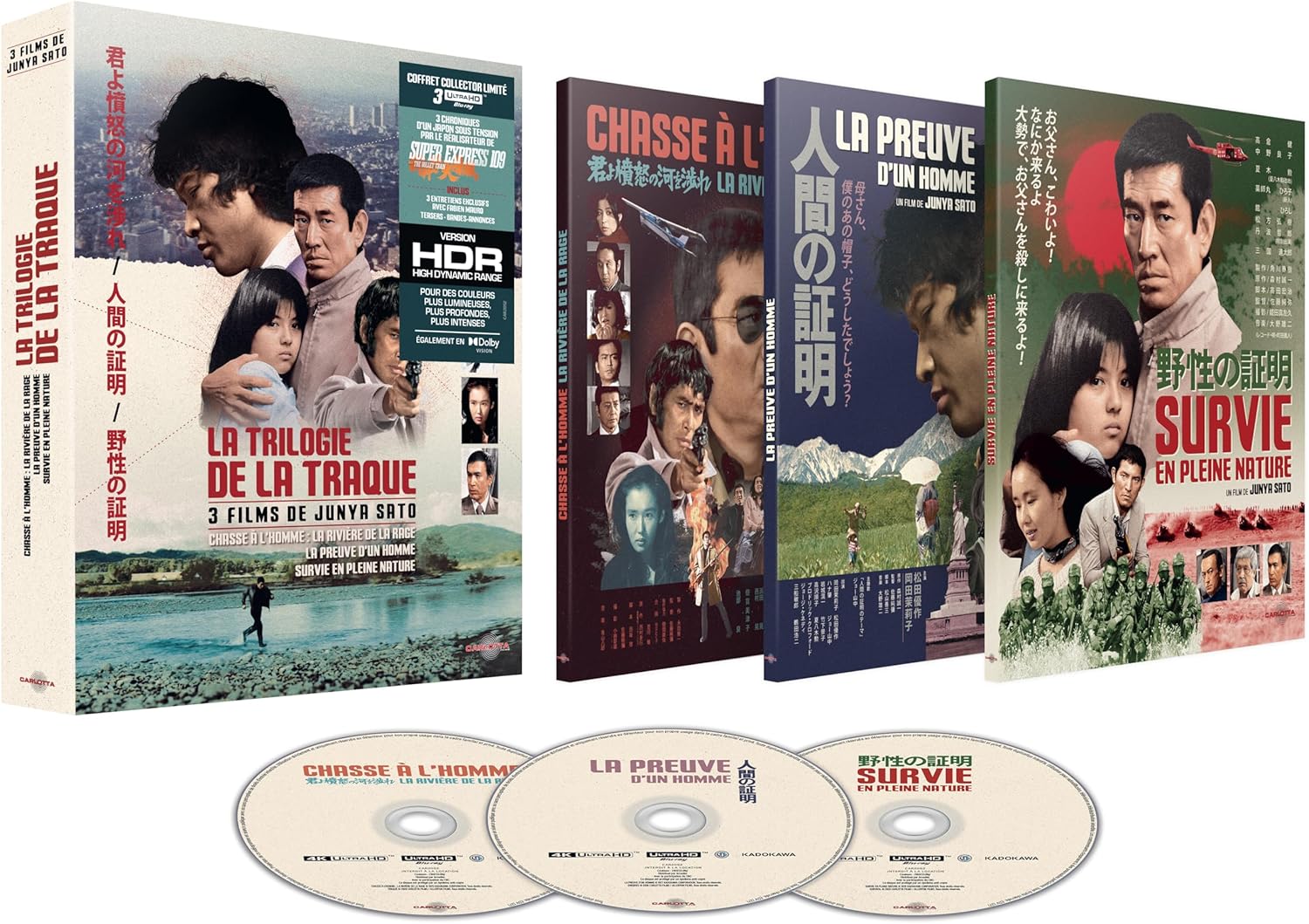 Trilogie de la traque Blu Ray 4K. Avec Super Express 109, sorti en 1975, Junya Sato s’impose comme l’un des maîtres incontestés du cinéma d’action et de suspense japonais des années 1970. Ce coffret collector limité réunit trois longs métrages emblématiques du réalisateur, formant une trilogie informelle autour d’un même thème : l’homme ordinaire ou hors du commun confronté à des systèmes sociaux et politiques défaillants, contraint de fuir, de lutter, de survivre. Ces trois films, réunis pour la première fois dans une édition 4K Ultra HD, témoignent de la puissance narrative et visuelle d’un cinéaste capable de jongler entre le thriller nerveux, le drame existentiel et la critique institutionnelle.