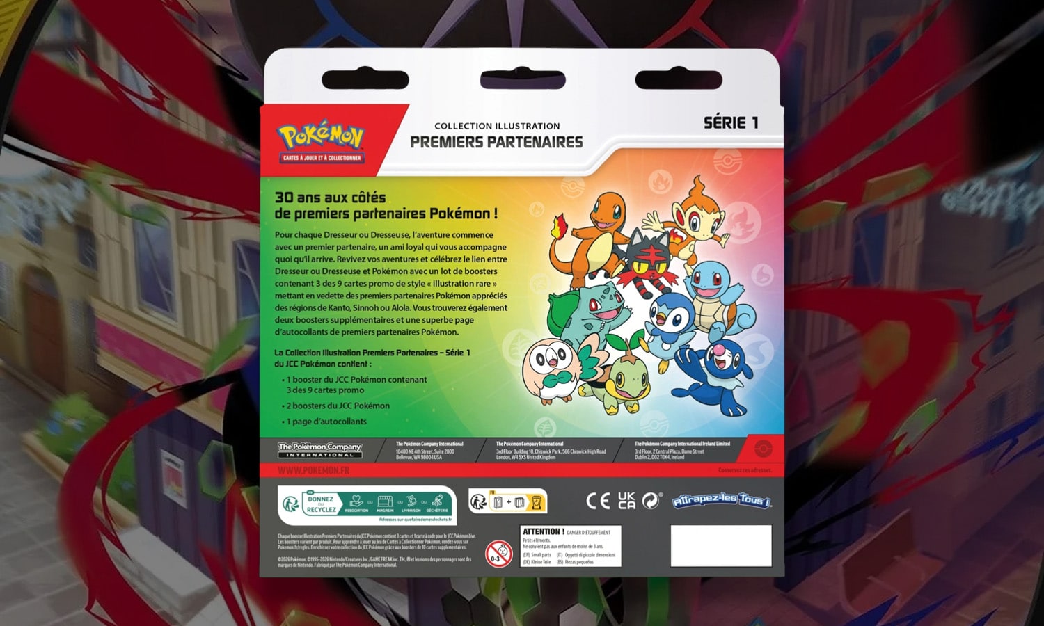 Collection Illustration Premiers Partenaires Série 1. Célébrez 30 ans d’aventure Pokémon avec la Collection Illustration Premiers Partenaires Série 1, un coffret haut en couleur qui rend hommage aux tout premiers compagnons de chaque Dresseur. De Kanto à Alola, retrouvez les créatures emblématiques qui ont marqué des générations de joueurs et de collectionneurs. Cette édition spéciale met à l’honneur les Pokémon de départ à travers des cartes promo au style illustration rare, idéales pour enrichir votre collection ou sublimer vos classeurs.
