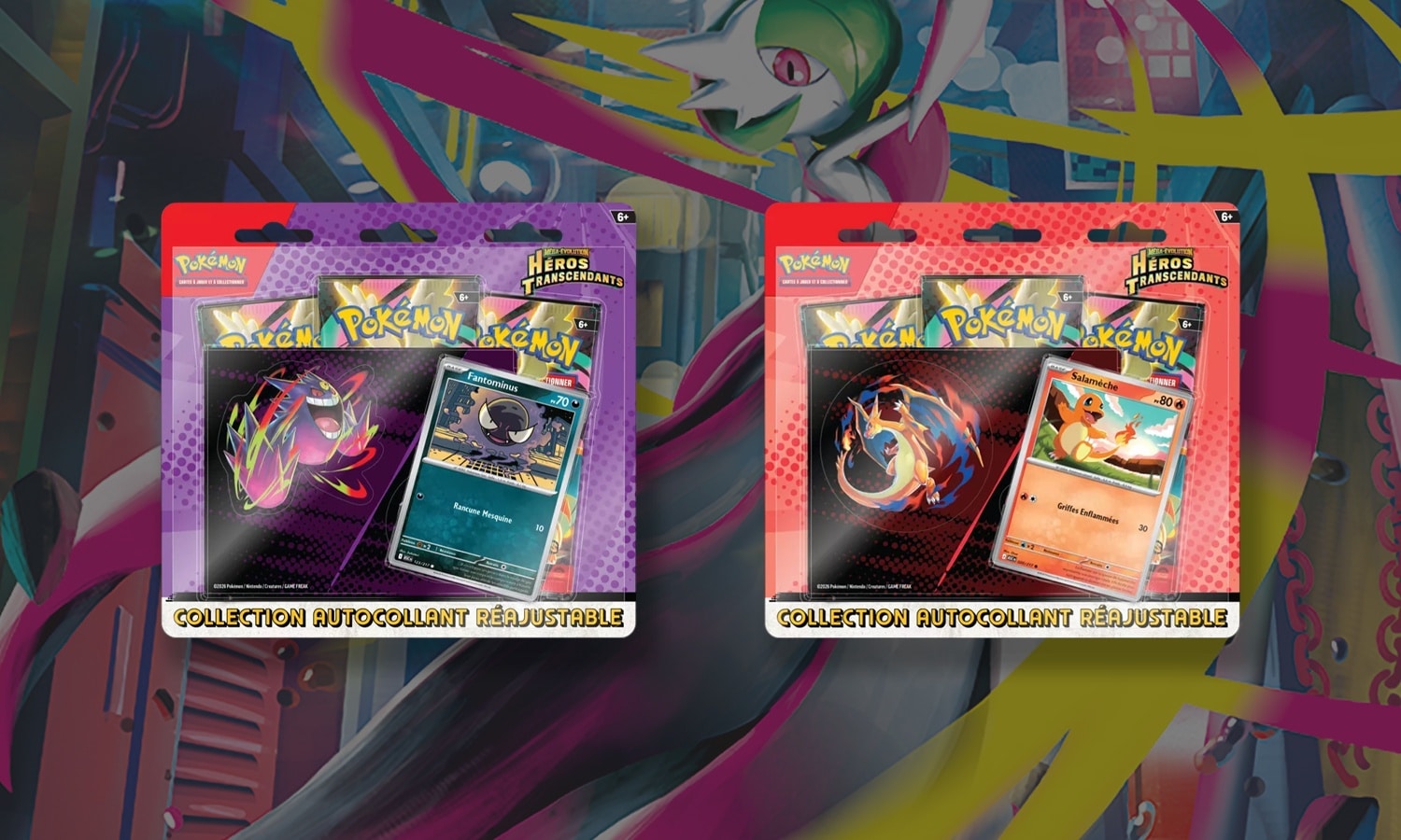 Chaque pack contient trois boosters Héros Transcendants, une carte promo brillante exclusive, ainsi qu’un autocollant repositionnable à l’effigie du Pokémon vedette du pack. Deux modèles sont disponibles :