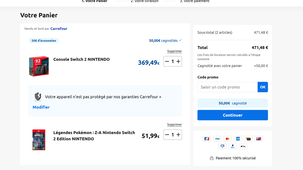 Pour profiter de l’offre, il faut cliquer sur la section promotionnelle en dessous du prix afin d’accéder au formulaire d’ajout des produits. Ajoutez la console puis le jeu Légendes Pokémon Z-A au panier.