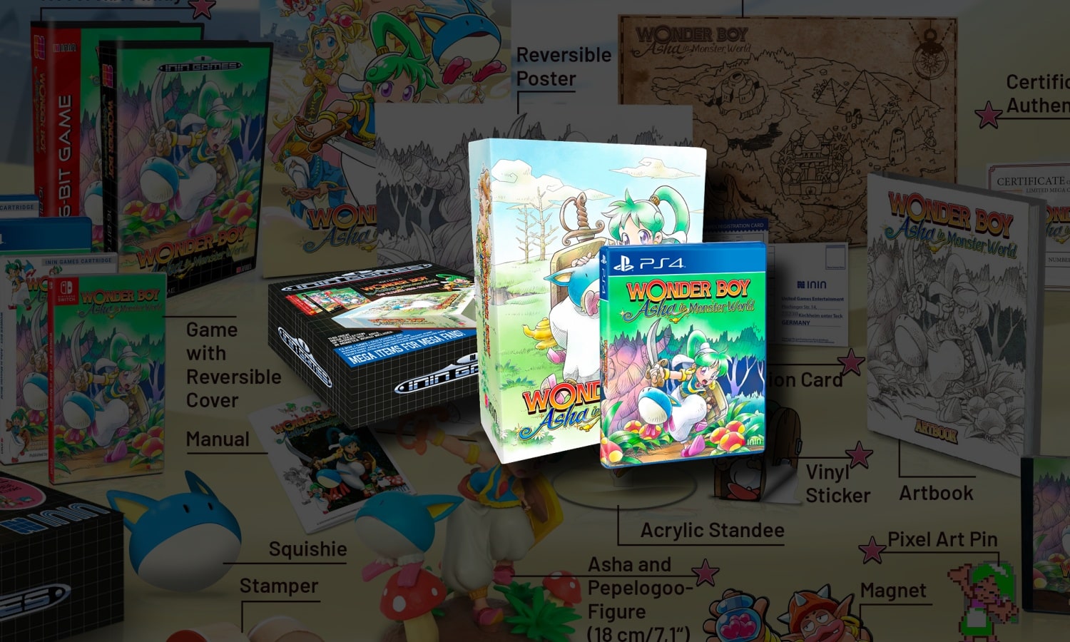 Wonder Boy Mega Collector’s Edition PS4. Cette édition PlayStation 4 propose un jeu d’action-aventure centré sur Asha, une héroïne qui quitte son quotidien pour répondre à une mission de sauvegarde. Le joueur explore des environnements alternant phases de déplacement, séquences de plateforme et confrontations, avec l’aide de Pepelogoo, un compagnon volant bleu qui soutient la progression lors des passages demandant précision et observation. Le titre est présenté comme officiellement licencié, avec une édition distribuée en exclusivité, numérotée individuellement et annoncée comme limitée à 499 exemplaires dans le monde.