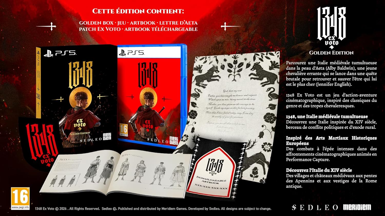 1348 Ex Voto Golden Edition PS5. Cette production vidéoludique propose de revisiter l’Italie médiévale à travers une approche historique et immersive, en mettant en scène une période marquée par la peste et les bouleversements sociaux. Le joueur incarne une chevaleresse dans un environnement soigné, traversant des lieux emblématiques et confronté à la rudesse de la vie au XIVe siècle. L’édition Golden met l’accent sur la richesse du scénario et la diversité des environnements qui rappellent le contexte de l’Italie de cette époque.