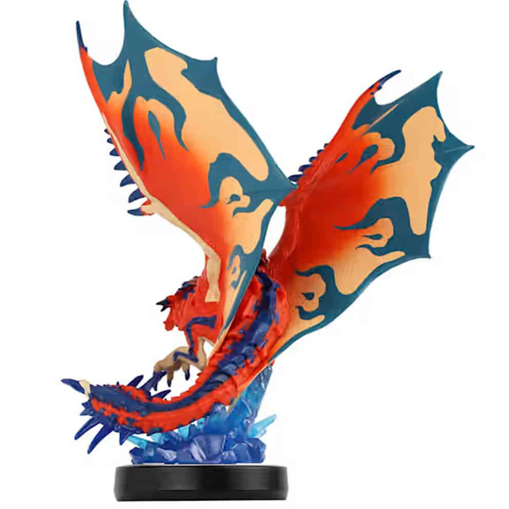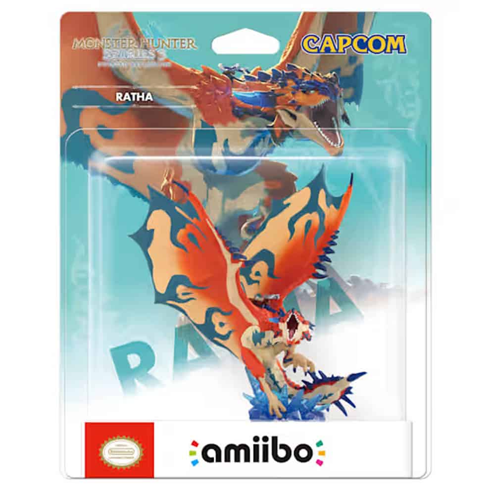 Amiibo Ratha Monster Hunter Stories 3. Cette figurine représente Ratha, un Rathalos azurécailles et compagnon du protagoniste dans Monster Hunter Stories 3: Twisted Reflection. Fidèle à son apparence dans le jeu, il est représenté en plein vol, ailes déployées, avec un socle translucide rappelant un environnement cristallin. Ce modèle est compatible avec la Nintendo Switch 2 et permet de débloquer des bonus exclusifs dans le jeu.