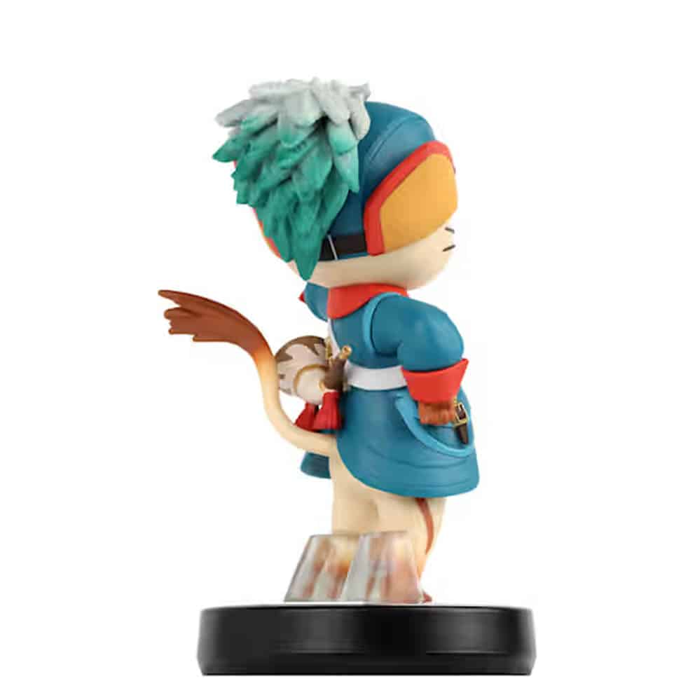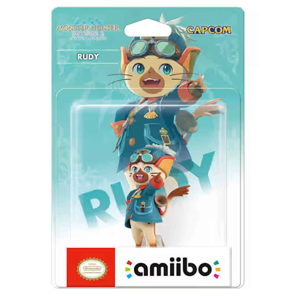 L’amiibo représente Rudy dans une tenue bleue ornée de détails dorés, avec une coiffe à plumes vertes, un sac à dos équipé d’une corne, et une paire de lunettes sur le front. Il est sculpté dans une pose expressive, le bras tendu vers l’avant, sur un socle noir classique avec support. Le produit est officiel Nintendo et compatible avec les consoles Nintendo Switch 2 grâce à la technologie NFC. En plus de son usage en jeu, la figurine peut aussi intéresser les collectionneurs attachés à l’univers Monster Hunter.