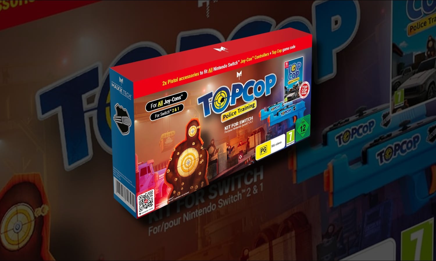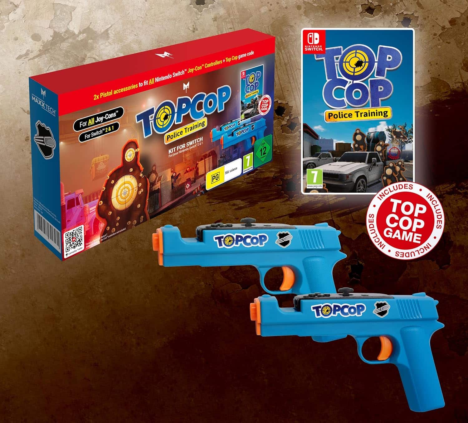 Top Cop Police Training Gun Kit Switch 1 et 2. Ce kit permet aux joueurs de profiter d’une expérience de tir arcade sur Nintendo Switch grâce à deux accessoires en forme de pistolets spécialement conçus pour accueillir les Joy-Con. L’accès au jeu se fait via un code de téléchargement, offrant des contenus adaptés aussi bien au jeu en solo qu’en multijoueur local.