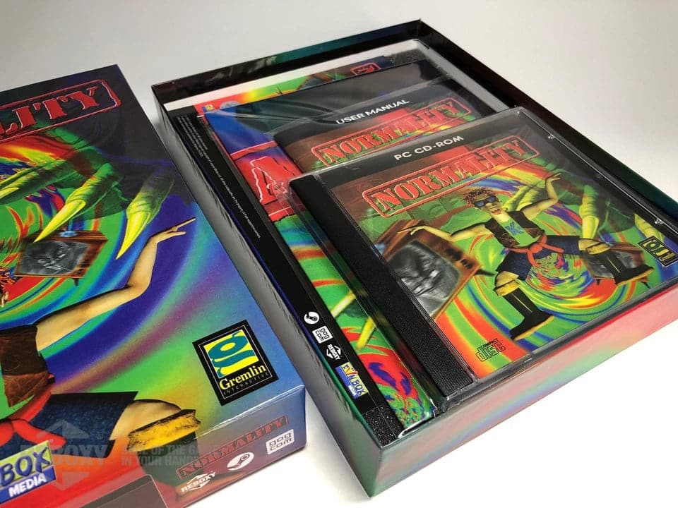 Normality Reboxy Classic Edition PC. Développé par Gremlin Interactive et publié en 1996, Normality est un jeu d’aventure graphique à la première personne teinté d’humour absurde et de satire sociale. Ce classique oublié du point-and-click PC retrouve une existence physique grâce à l’edition Reboxy Classic, dans un écrin digne des grandes boîtes des années 90.
