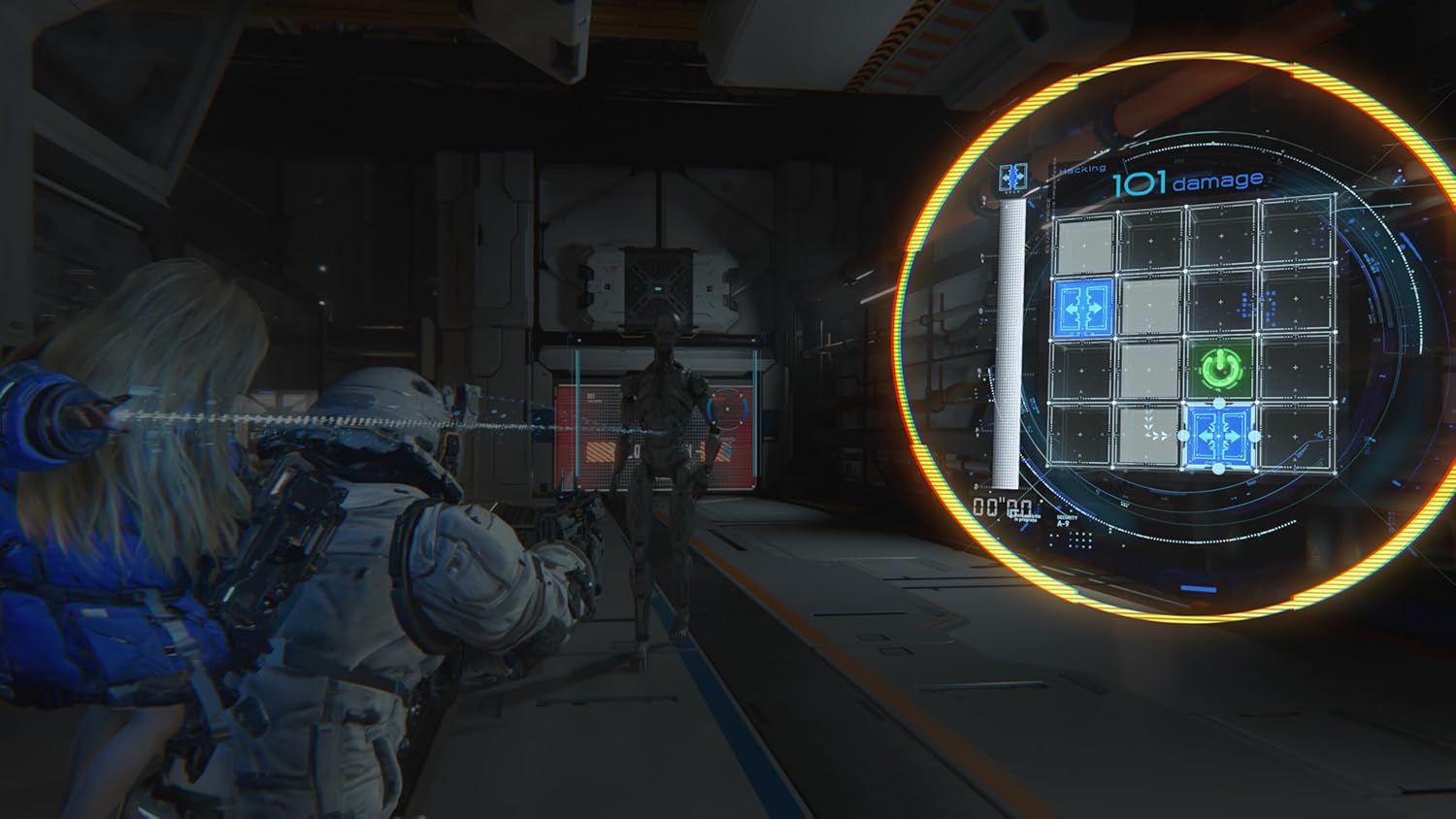 Le système de combat Hack & Shoot impose une alternance stratégique entre piratage et attaques armées. Chaque affrontement, opposant principalement des ennemis robotiques, débute par une phase où les capacités de piratage de l’androïde Diana doivent être utilisées pour affaiblir ou désactiver les protections ennemies.