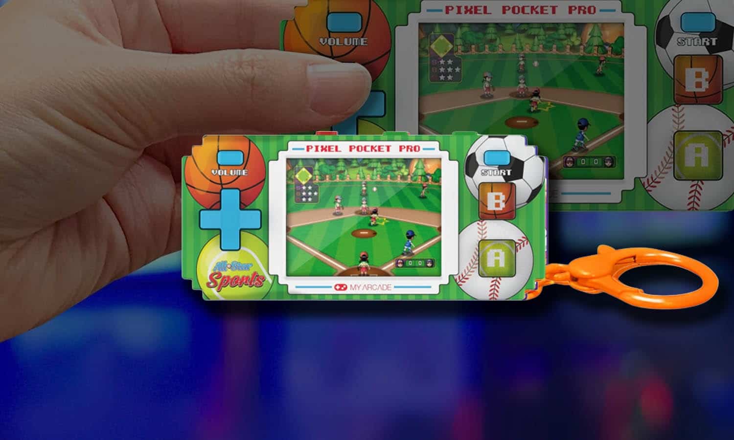 My Arcade Pixel Pocket Pro All-Star Sports. Ce dispositif mobile propose l’accès à une sélection de jeux vidéo rétro mettant en avant des thématiques sportives. Le produit se présente sous un format compact doté d’un écran couleur de petite taille, permettant de jouer à divers titres classiques à tout moment et en tout lieu. Son design pratique facilite le transport et la prise en main lors des sessions de jeu en déplacement.