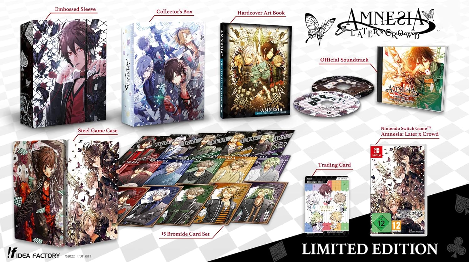 Amnesia Later x Crowd Edition Limitée Switch. Cette version réunit Amnesia Later et Amnesia Crowd, et propose une multitude de scénarios ainsi que de nouveaux mini-jeux. Elle permet d’approfondir votre relation avec les personnages principaux et secondaires de Amnesia Memories. Le jeu dispose de voix en japonais et de sous-titres en anglais.