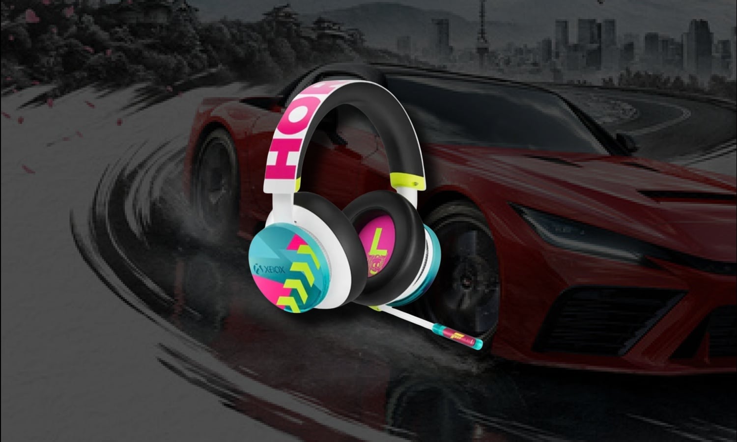 L’identité visuelle de ce casque repose sur une palette chromatique particulièrement affirmée, directement tirée de l’esthétique du jeu qu’il accompagne. On retrouve ainsi un mariage de bleu sarcelle, rose néon, blanc et vert jaune fluo, des teintes qui reflètent l’énergie et l’atmosphère festive caractéristiques de la série Forza Horizon. Ce choix colorimétrique tranche volontairement avec les références plus sobres habituellement proposées dans la gamme des casques sans fil Xbox, ce qui en fait une pièce reconnaissable au premier regard.