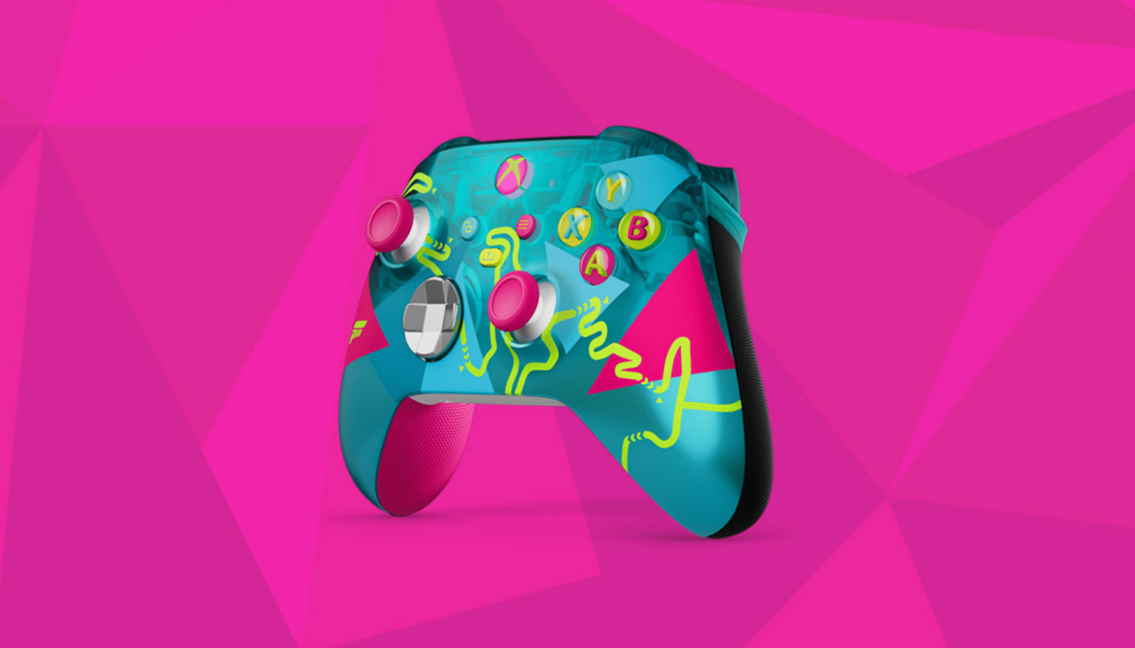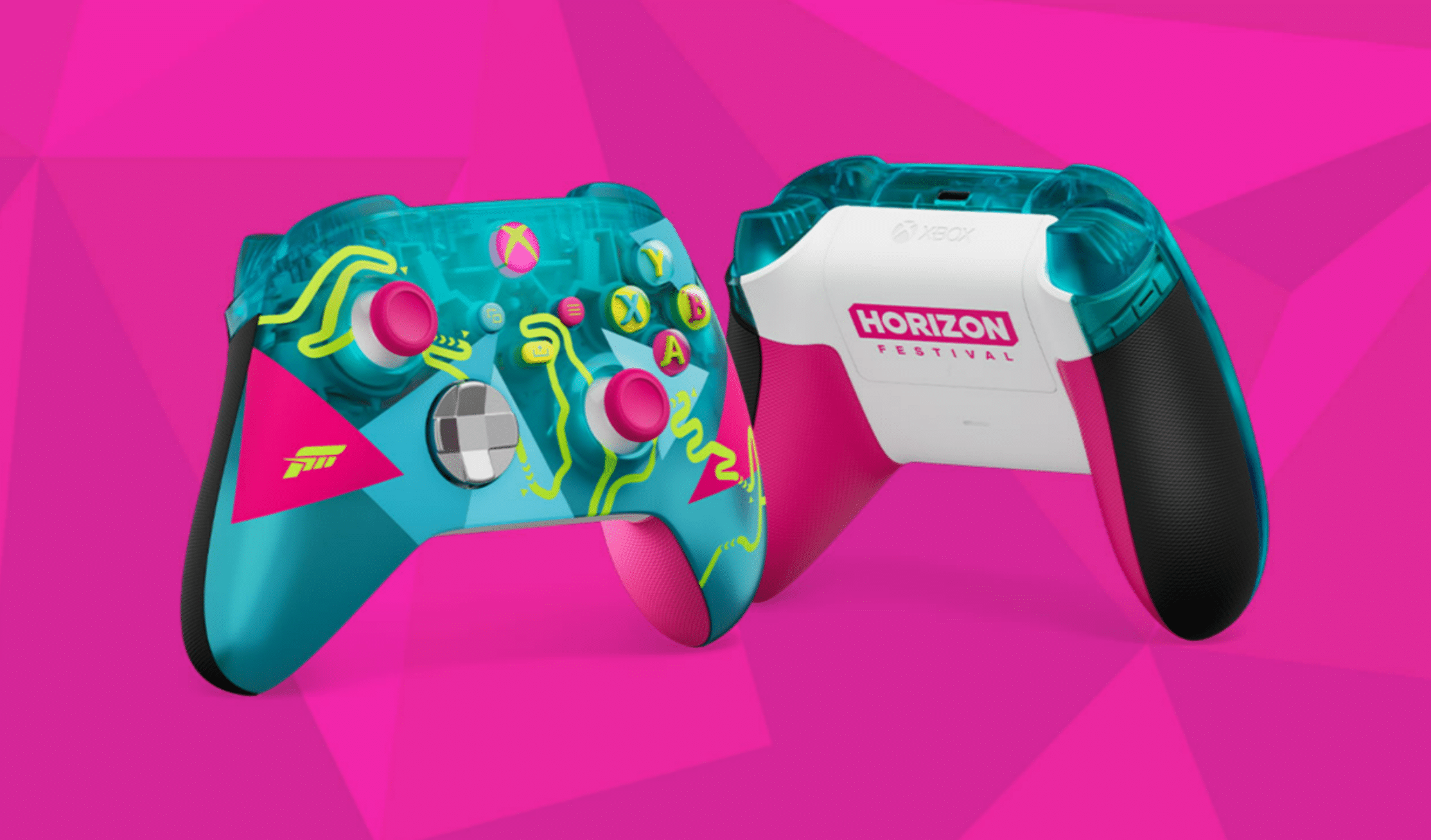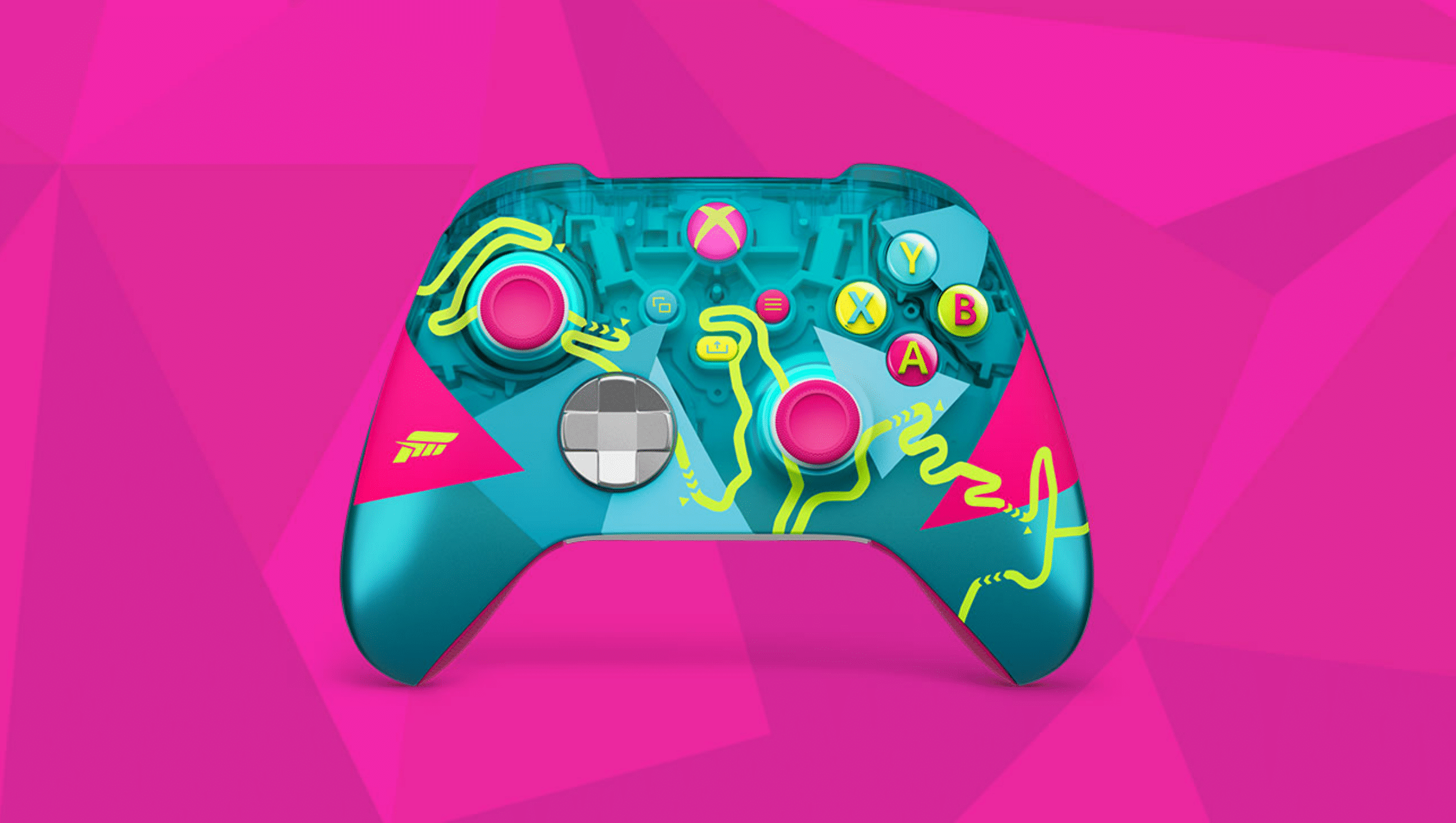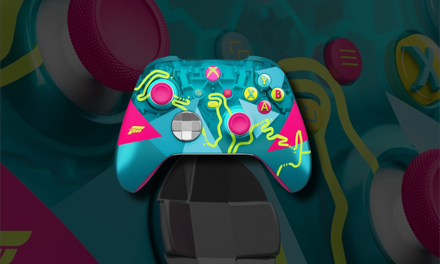 Manette Xbox Édition Limitée Forza Horizon 6. Cette manette sans fil en édition limitée est conçue en collaboration avec la franchise Forza Horizon. Son design se distingue par une palette chromatique marquée, associant le bleu sarcelle, le rose néon et des touches de jaune fluo, évoquant les paysages japonais qui servent de décor au titre. Il s’agit seulement du deuxième modèle en édition limitée lancé après la manette DOOM: The Dark Ages, ce qui en fait une référence relativement rare dans la gamme des périphériques Xbox collector.