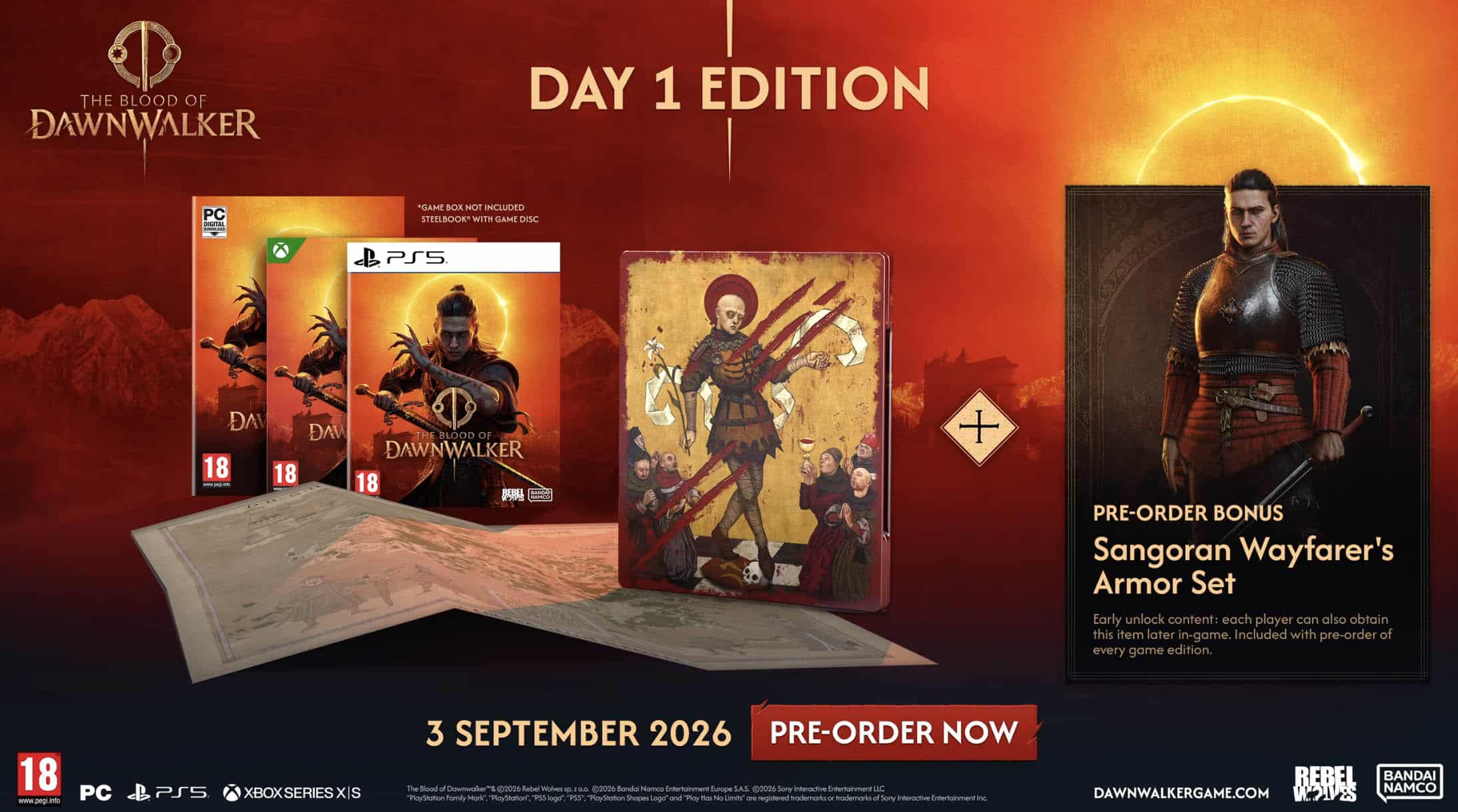 - Bonus de précommande digital Bandai Namco : Ensemble de Voyageur Sangorien, permettant d’équiper Coen de l’armure du Voyageur Sangorien, ornée de l’emblème d’un forgeron anonyme ayant sillonné le continent en quête d’inspiration (contenu débloqué en avance, disponible également plus tard dans le jeu)