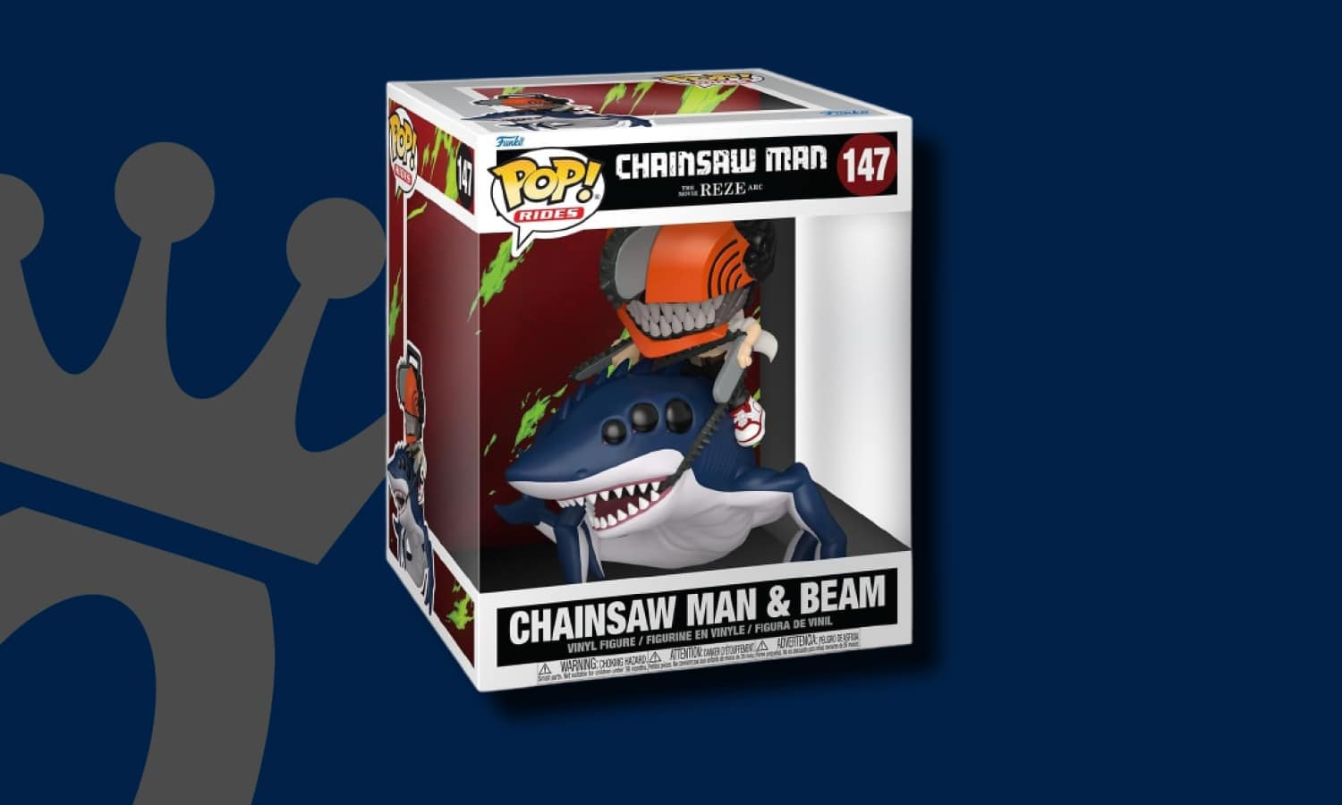 Funko Pop Chainsaw Man Reze Beam. Chainsaw Man, héros déjanté du manga éponyme, chevauche ici Beam, le Démon-Requin, issu de l’arc Reze. Cette figurine rend hommage à l’univers sombre et explosif de la série animée produite par le studio MAPPA, adaptée du manga de Tatsuki Fujimoto.