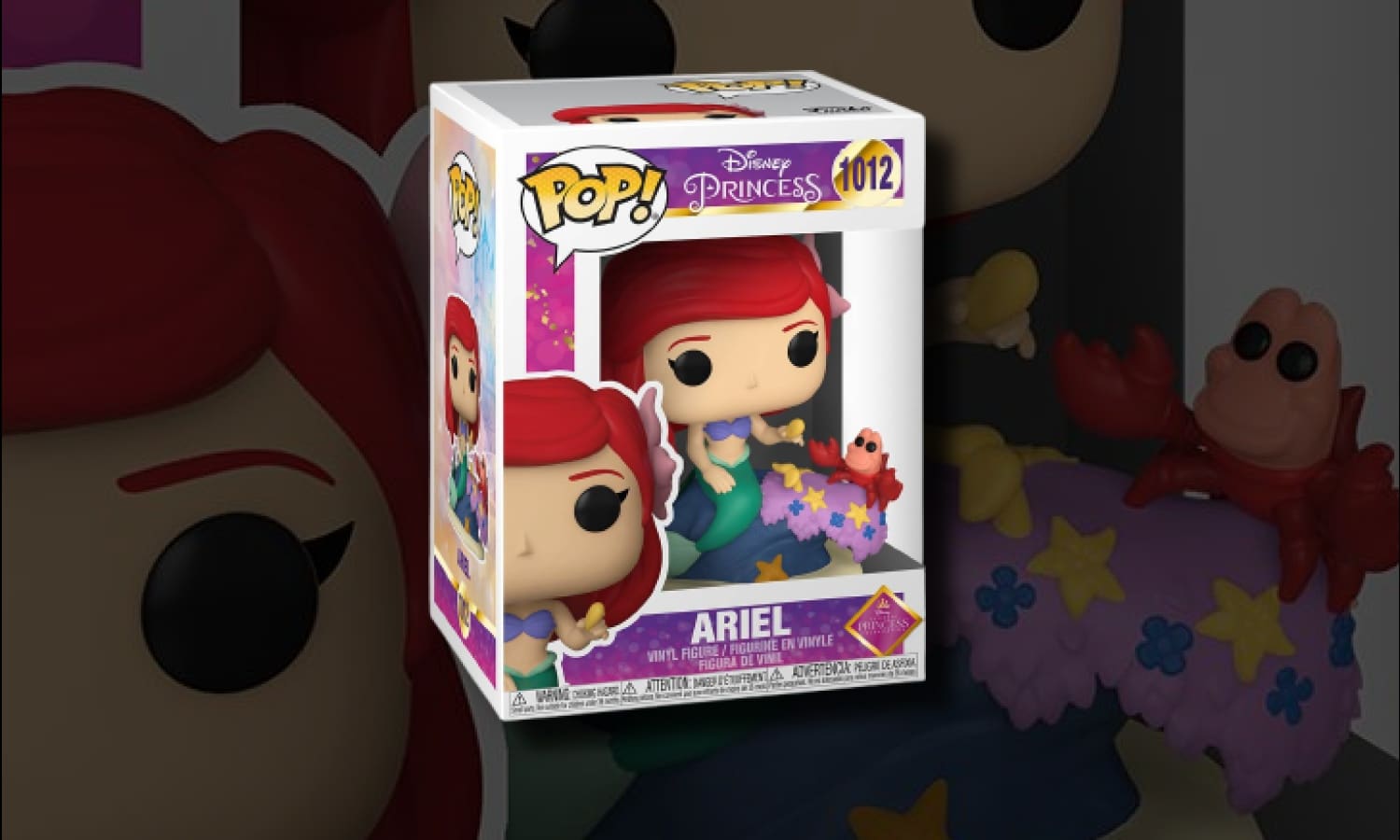 Funko Pop Disney Ultimate Princess Ariel 1012. Ariel, héroïne du film Disney La Petite Sirène, est représentée dans la collection Disney Ultimate Princess. La princesse sirène apparaît avec sa chevelure rousse, sa queue verte et un décor marin inspiré d’Atlantica, accompagnée de Sébastien. Référence 1012, édition Funko Pop de l’univers Disney.
