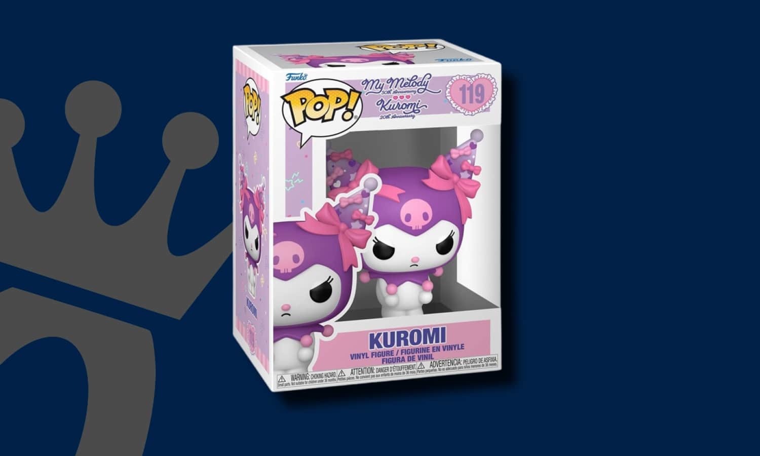 Funko Pop Hello Kitty Kuromi Grognon. Figurine vinyle Pop produite par Funko, représentant Kuromi, personnage Sanrio lié à l’univers Hello Kitty. Modèle variant Grognon, avec expression renfrognée, capuche noire à tête de mort rose et oreillettes. Format stylisé environ 9 à 10 cm, finition brillante, boîte vitrine.