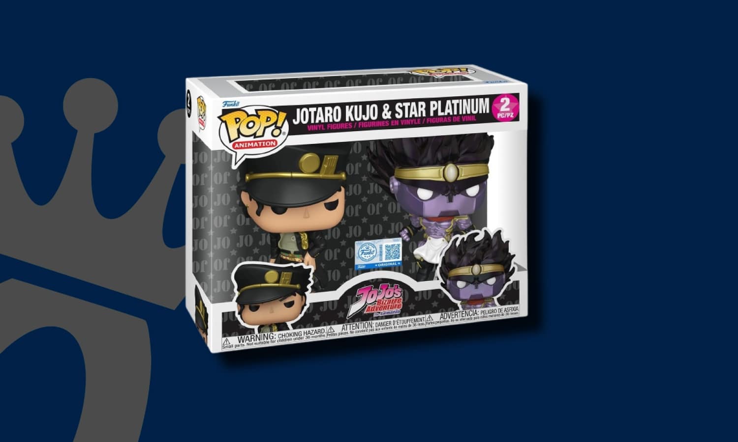 Funko Pop JoJo’s Bizarre Adventure 2 Pack Exclusif. Ce pack exclusif de Funko Pop met à l’honneur Jotaro Kujo et son Stand Star Platinum, personnages emblématiques de la série animée culte JoJo’s Bizarre Adventure produite par le studio David Production. Parfaits pour les fans de l’univers fantastique et excentrique de la saga.