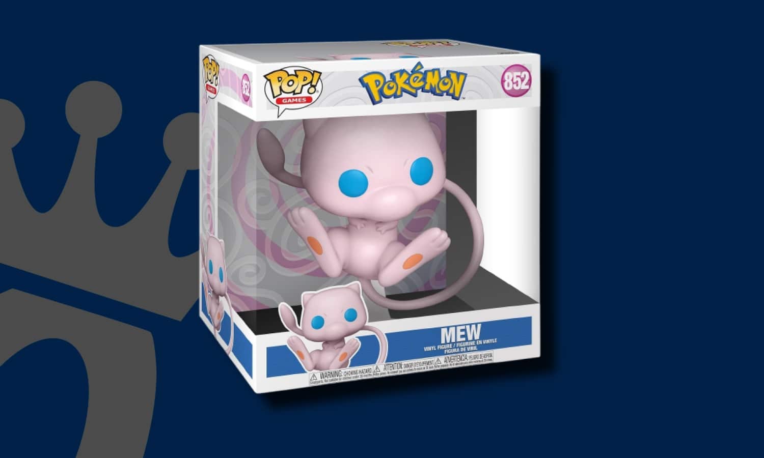 Funko Pop Jumbo Pokemon Mew. Mew, Pokémon mythique de type Psy, est représenté dans une version Jumbo au style vinyle de Funko. Inspiré de la licence Pokémon de Nintendo, Game Freak et Creatures, il apparaît assis, avec ses grands yeux bleus et sa longue queue enroulée, fidèle à son design emblématique de la première génération. Modèle Pop Games numéro 852.
