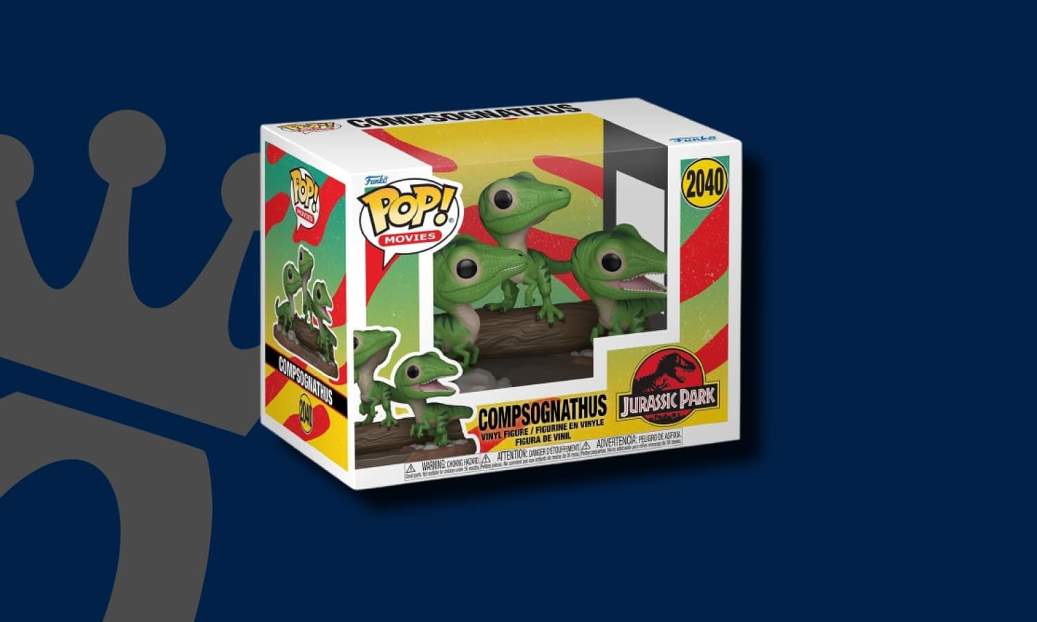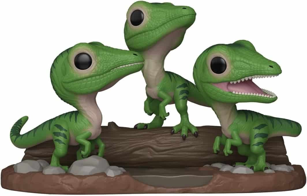 Funko Pop Premium Jurassic Park Compy. Le Compsognathus, petit dinosaure opportuniste de l’univers Jurassic Park, est représenté ici en scène de groupe sur un décor.