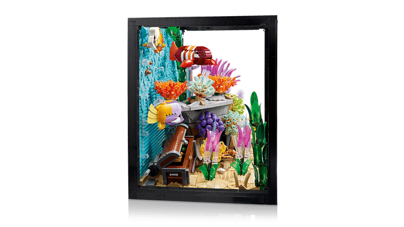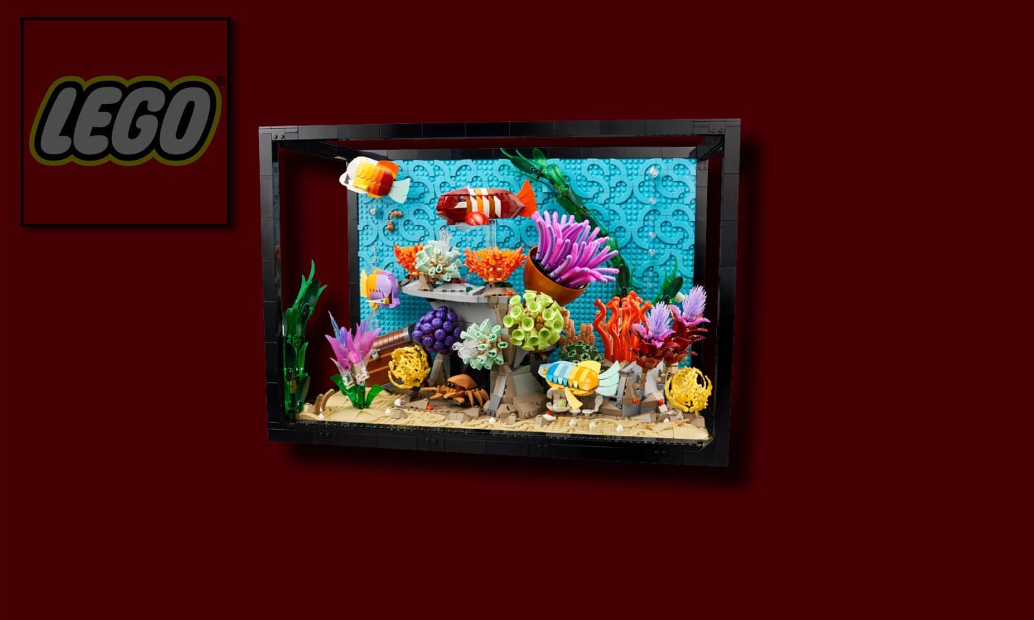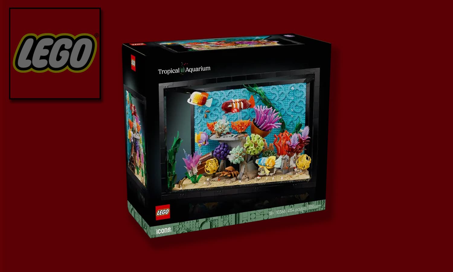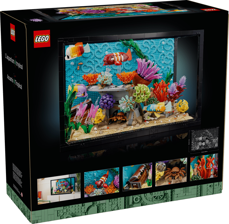 LEGO 10366 Aquarium Tropical. Ce set de construction pour adultes permet de réaliser une réplique détaillée d’un aquarium miniature. Avec un grand choix de pièces, il offre la possibilité d’assembler un décor aquatique comprenant différentes espèces et éléments typiques des fonds marins.