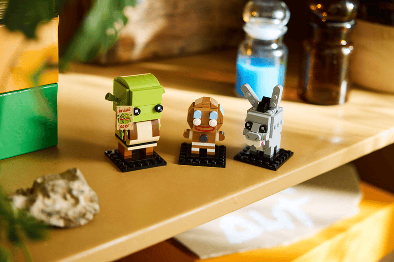 Le set comprend la reproduction en briques de l’ogre vert le plus célèbre du cinéma d’animation, accompagné de deux de ses fidèles compagnons. La figurine principale arbore l’un des accessoires les plus reconnaissables de la franchise : un panneau « Beware Ogre » tenu à la main, référence directe à l’une des scènes les plus connues du premier film. Ce détail narratif renforce l’identité du personnage et permet aux fans de retrouver instantanément l’atmosphère de l’univers d’origine.