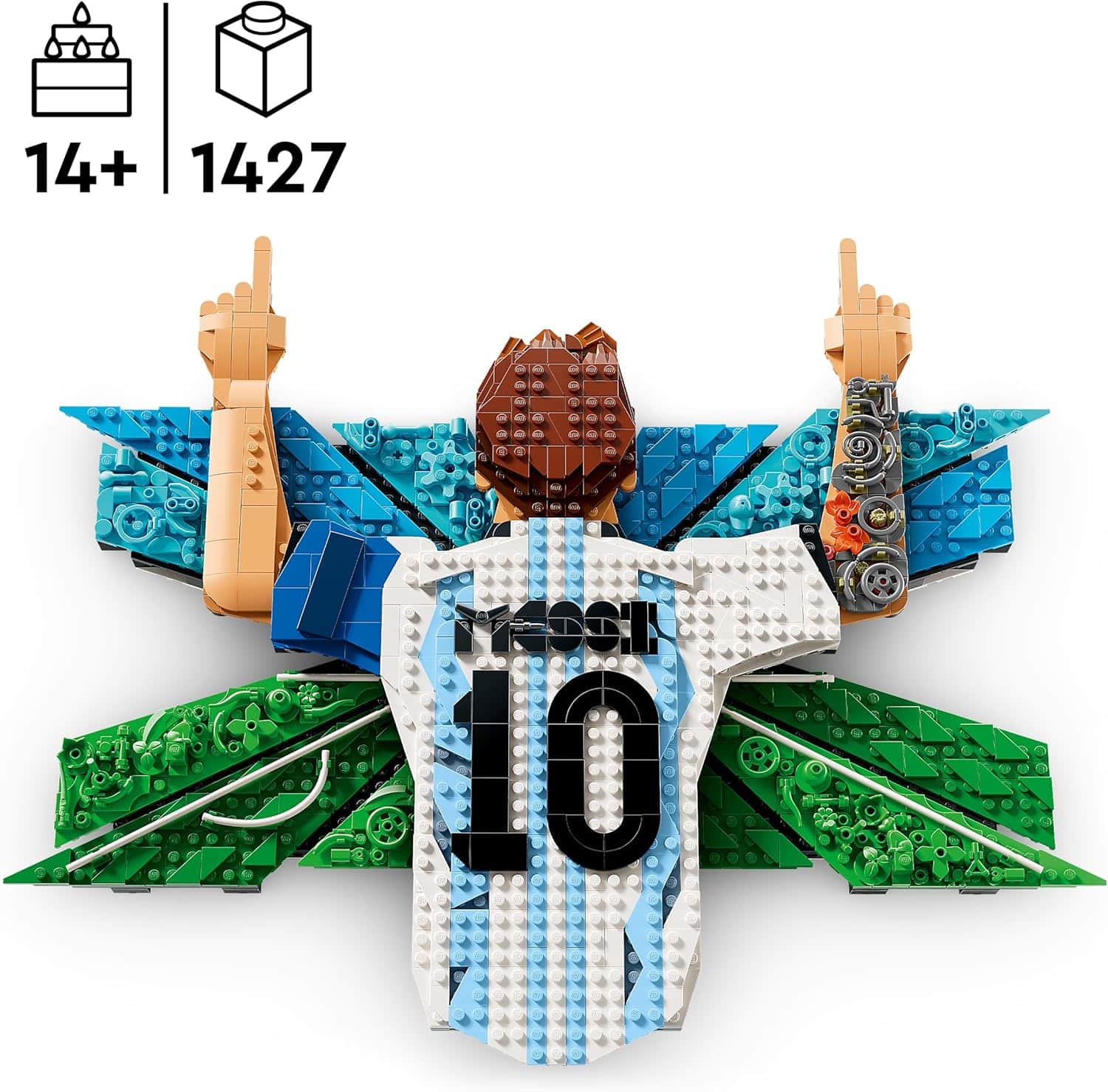 Le set représente Lionel Messi dans sa pose de victoire iconique, les doigts pointés vers le ciel, se détachant sur un fond texturé évoquant à la fois le ciel et le terrain. La pièce maîtresse est sans conteste le célèbre maillot rayé numéro 10, reproduit avec un souci du détail remarquable. Composé de 1427 pièces, ce modèle offre de longues heures de construction engagées et minutieuses. Une fois terminé, il peut être accroché au mur grâce au crochet inclus, transformant ainsi n’importe quelle chambre ou bureau en véritable espace dédié à la passion du foot.