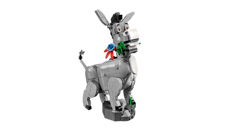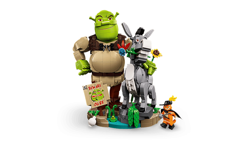 Le set met en scène trois figures incontournables de la saga : Shrek, l’Âne et le Chat Potté. Shrek et l’Âne sont représentés sous forme de figurines articulées en briques, offrant un niveau de détail soigné et une liberté de mouvement notable. Le Chat Potté, quant à lui, est inclus sous la forme d’une minifigurine au format classique LEGO.