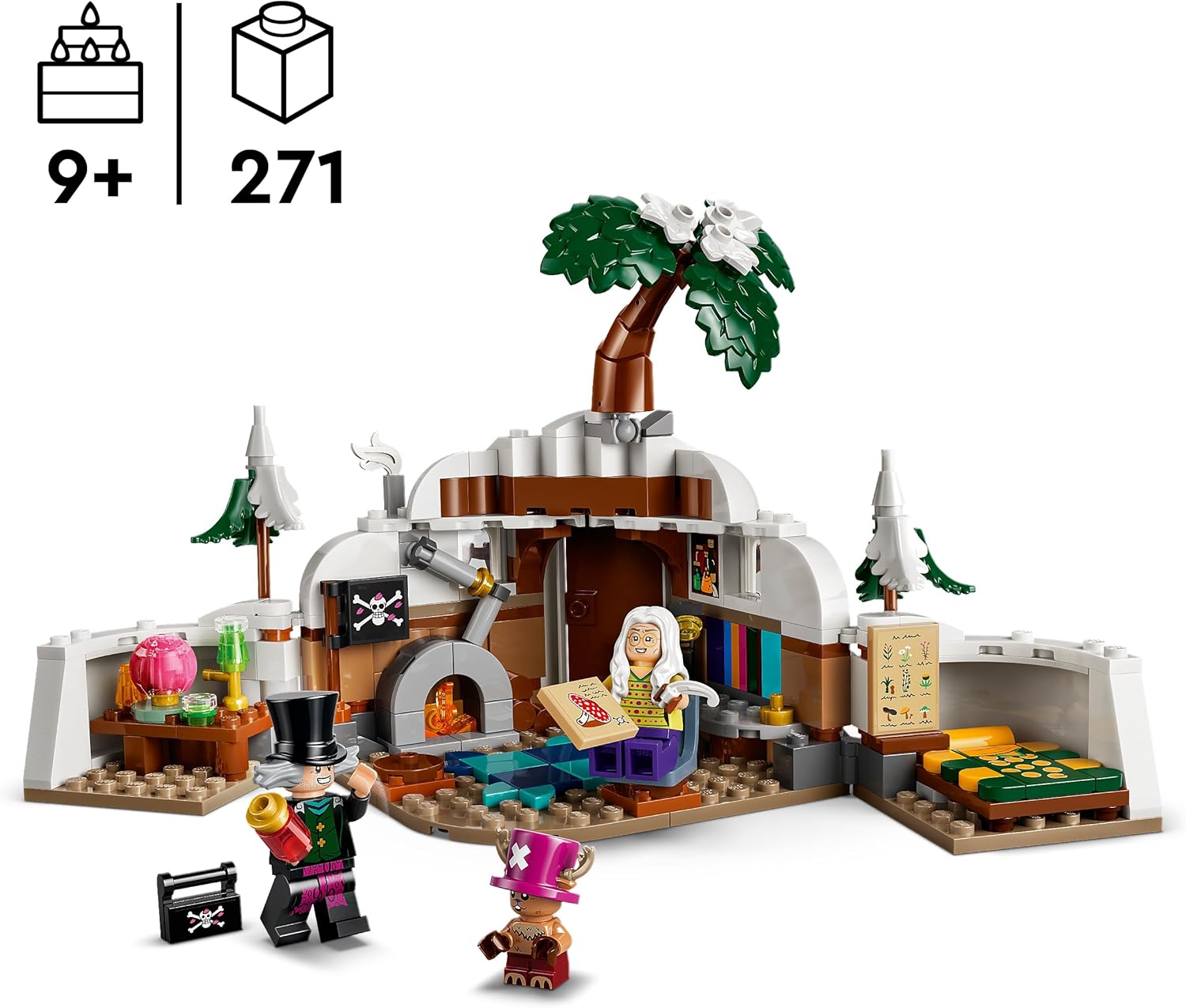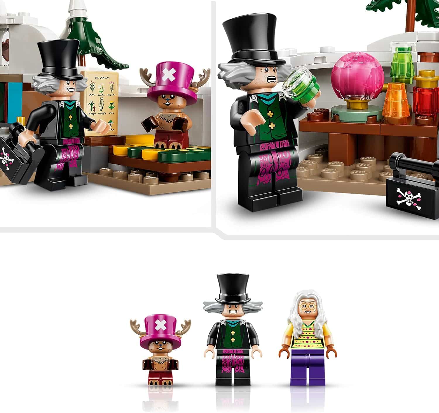 Ce set inclut trois minifigurines emblématiques directement tirées de la série : Tony-Tony Chopper, le docteur Hiluluk et le docteur Kureha. Chopper est représenté avec son célèbre chapeau rose d’où émergent ses bois, un détail caractéristique immédiatement reconnaissable par les fans. Le docteur Hiluluk est doté de son chapeau distinctif, tandis que le docteur Kureha complète ce trio de personnages liés par une relation forte au sein de la fiction.