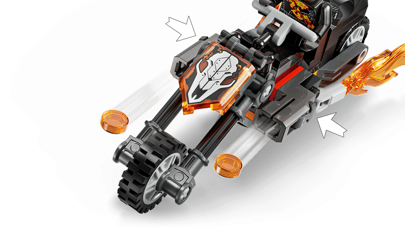 La moto, élément central du set, est équipée de deux pots d’échappement avec flammes rappelant la signature visuelle du personnage conducteur, et inclut également deux fusils à tenons pour renforcer l’interactivité et varier les options de jeu. Le véhicule se distingue par ses dimensions accessibles, avec plus de 4 cm de hauteur, 14 cm de longueur et 5 cm de largeur, et il est possible de le personnaliser, notamment grâce à la toile d’araignée qui peut être fixée à différents emplacements sur la moto.