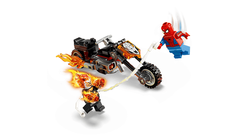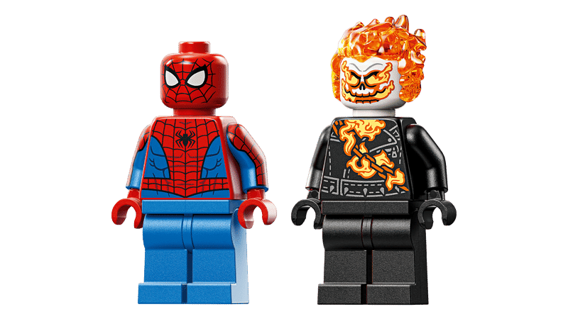 Le coffret comprend deux minifigurines principales issues de l’univers Marvel : un super-héros spécialiste des acrobaties aériennes équipé de toiles, et une figure squelettique mise en valeur par des effets de flammes sur les mains et la tête. Ces figurines faciles à manipuler donnent la possibilité d’imaginer des affrontements, des courses-poursuites ou des alliances en fonction de l’histoire créée par l’enfant.