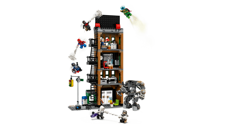 Les enfants peuvent recréer une scène explosive dans les rues animées de Manhattan. Mysterio et son robot menaçant sèment le chaos devant le Daily Bugle tandis que Spider-Man et Ghost-Spider interviennent pour sauver la situation. Les accessoires de combat, les toiles d’araignée et les effets lumineux recréent l’atmosphère des comics Marvel. Chaque niveau du bâtiment dévoile des détails cachés : la rédaction, les bureaux, l’écran d’informations et la célèbre enseigne du journal.