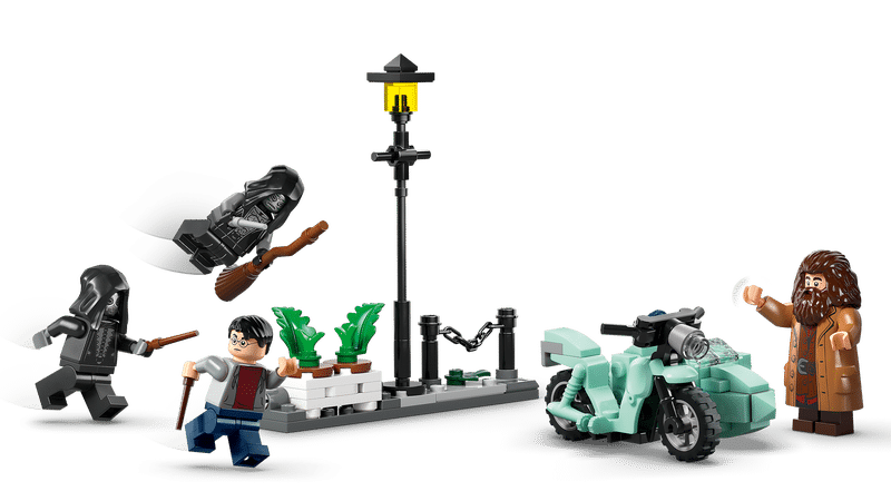 Le set met en scène le duo emblématique d’un jeune sorcier et de son allié, Hagrid, à bord d’une moto volante, dans une séquence d’évasion depuis une rue bien connue de la saga. Les personnages et accessoires fournis offrent différentes possibilités pour imaginer et jouer des scénarios variés.