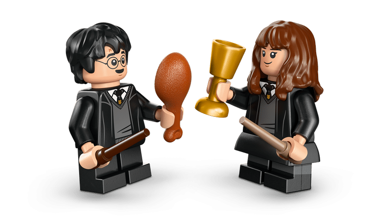 Grâce aux quatre minifigurines fournies, il est possible de recréer la scène avec les principaux personnages, chacun muni de sa baguette magique. Le décor comprend également une table garnie de nourriture, permettant de prolonger l’expérience de jeu après la cérémonie et de représenter l’ambiance conviviale de la salle commune. Un compteur de points est aussi présent, offrant de multiples scénarios ludiques pour simuler la compétition entre les maisons.