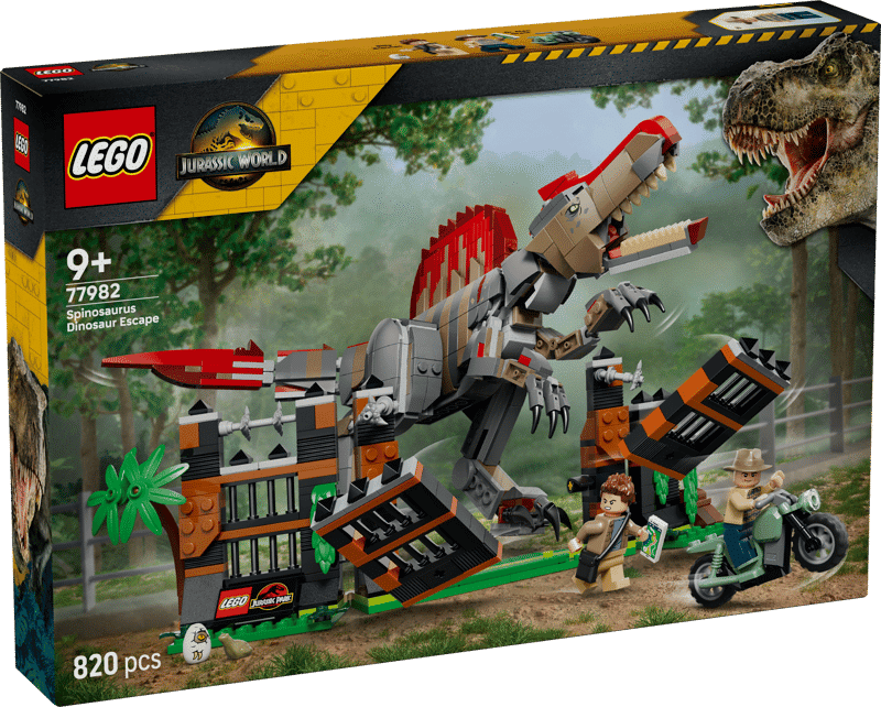 LEGO 77982 Spinosaure Évasion. L’évasion du spinosaure.Fans de dinosaures et de l’univers Jurassic World, ce set est fait pour vous. L’évasion du spinosaure est un set issu de la gamme Jurassic World qui se distingue immédiatement par son approche de construction hors du commun. Avec ses 820 pièces, il s’adresse aux enfants à partir de 9 ans et offre une expérience de montage à la fois engageante et accessible, idéale pour les amateurs de dinosaures de tous niveaux.