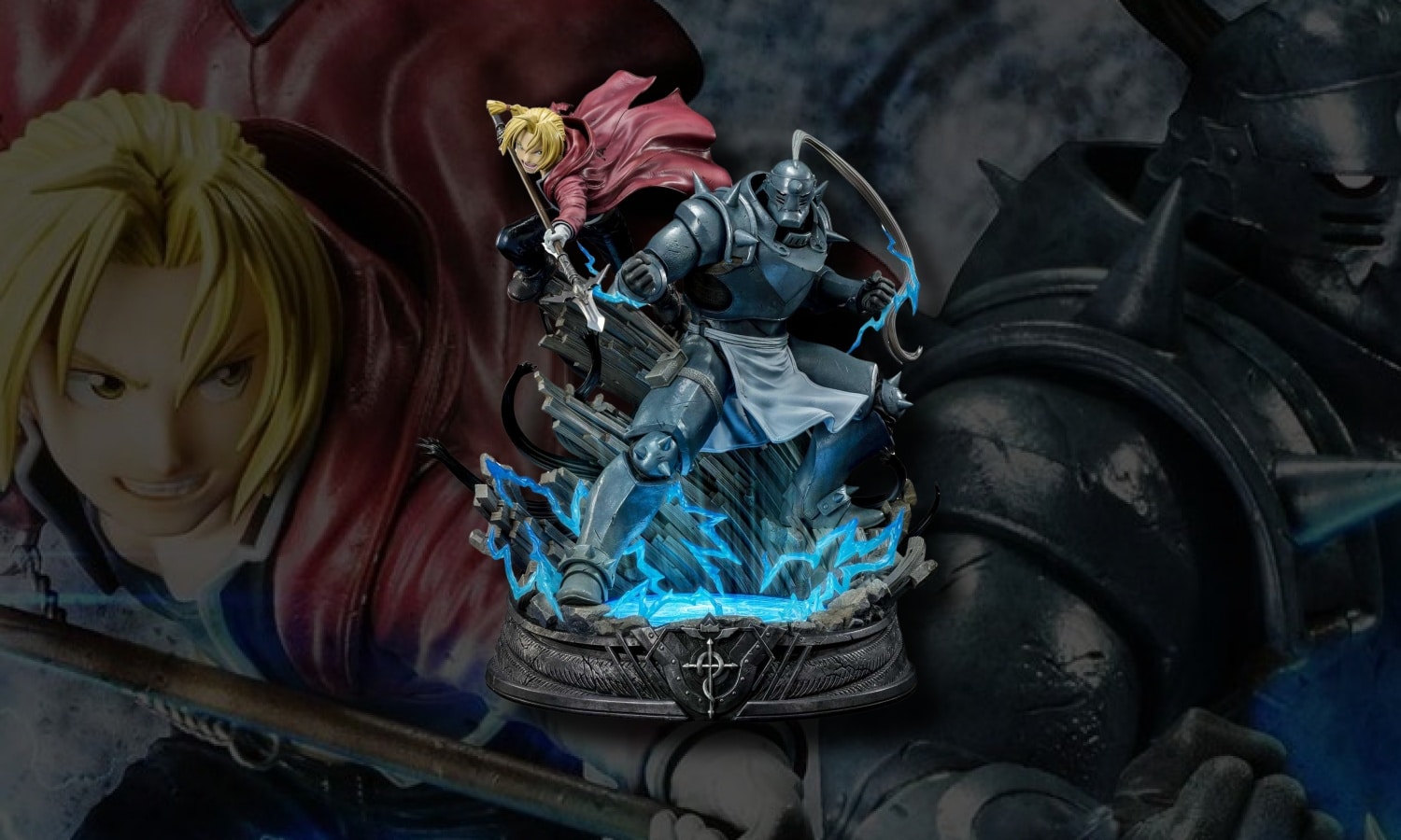 La composition place Edward Elric en position aérienne, suspendu au-dessus d’un sol transmué, dégageant une impression de mouvement et d’énergie alchimique. En contrepoint, Alphonse Elric adopte une posture défensive, solidement ancré sur un cercle de transmutation. Cette dualité entre les deux frères reflète leur complémentarité telle qu’elle est représentée dans l’œuvre originale. Chaque personnage bénéficie d’un travail sculptural attentif, notamment au niveau des armures, des vêtements et des expressions faciales, qui cherchent à restituer fidèlement l’univers graphique de la franchise.