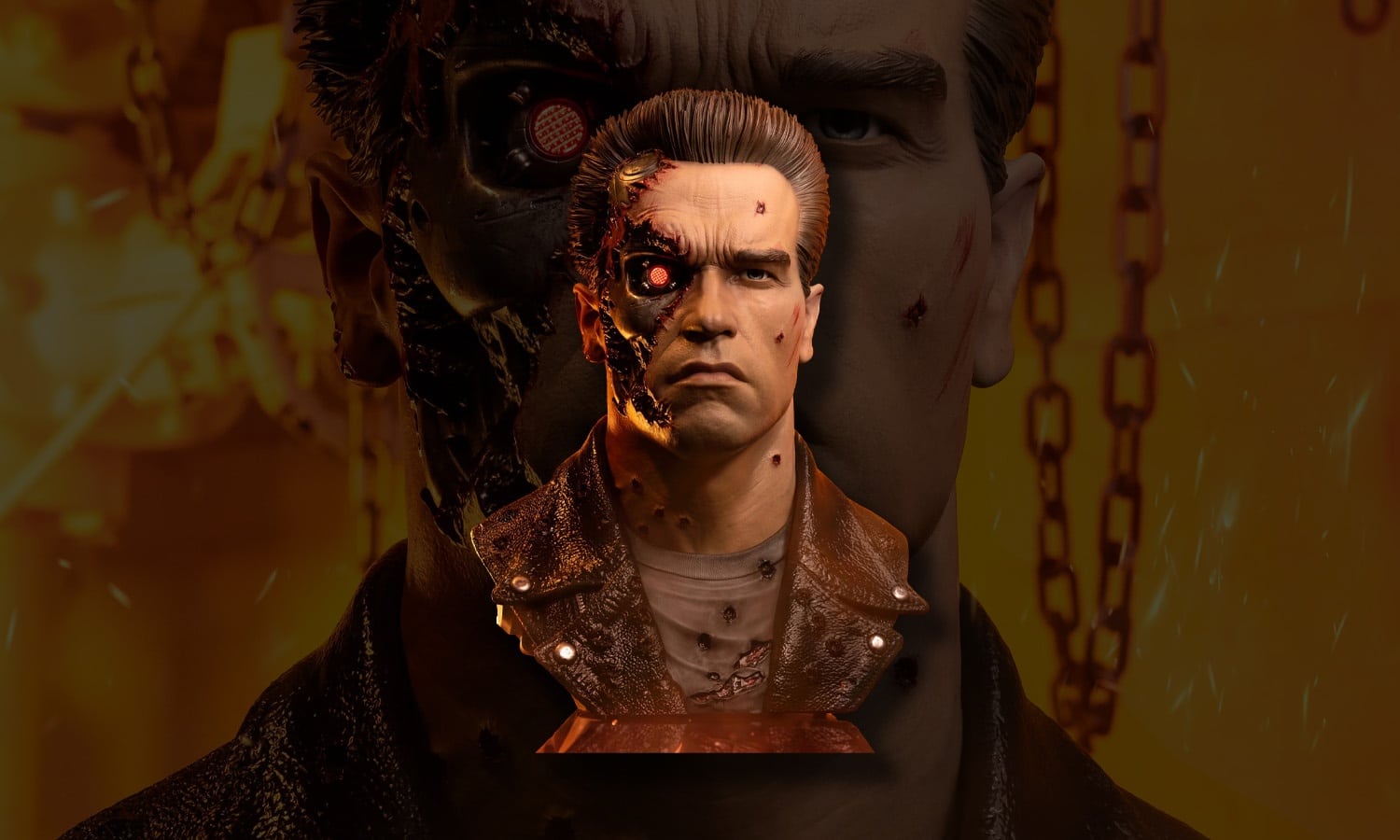La conception repose sur une sculpture annoncée comme hyper-détaillée, travaillée pour évoquer la ressemblance d’Arnold Schwarzenegger et l’identité visuelle associée au modèle 101. Le parti pris n’est pas celui d’une apparence intacte, mais d’une mise en scène des altérations, avec une peau synthétique et des tissus présentés comme arrachés ou lacérés. Cette approche vise à matérialiser l’idée d’un personnage soumis à l’usure et à la confrontation, en multipliant les indices de détérioration, sans rechercher l’uniformité d’une surface neuve.