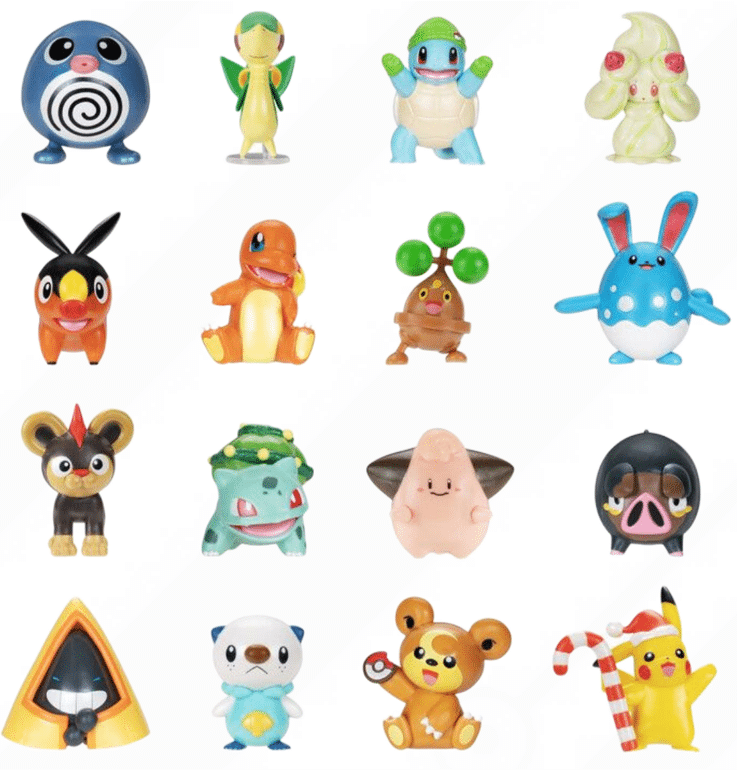 L’édition repose sur la notion de surprise à travers le mois de décembre, permettant d’obtenir quotidiennement un personnage ou un accessoire inédit. Les figurines, mesurant 5 cm et dotées d’une finition étincelante, se distinguent par des détails conçus pour la période des fêtes. Chaque personnage porte une tenue exclusive qui enrichit la gamme habituelle. Des figures emblématiques de l’univers sont incluses, dont Pikachu, Miaouss et Salamèche.