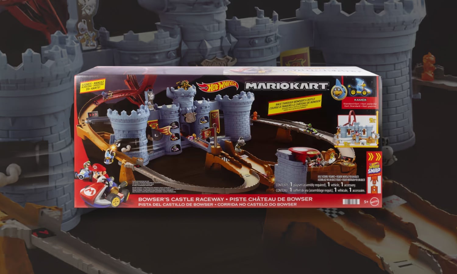 Coffret Hot Wheels Mario Kart Château de Bowser. Plongez dans l’univers de Mario Kart avec le coffret Château de Bowser de Hot Wheels, un circuit spectaculaire pensé pour les fans de la licence et les amateurs de cascades. Avec plus de 86 cm de parcours, ce set de jeu offre des fonctionnalités interactives comme un lanceur pour démarrer les courses, un drapeau compte-tours, et surtout un redoutable Bill Balle qui surgit pour éjecter les véhicules de la piste. Ce décor emblématique est peuplé de références visuelles fidèles à l’univers de Mario, avec un ascenseur mobile, des flammes animées et des personnages reconnaissables.
