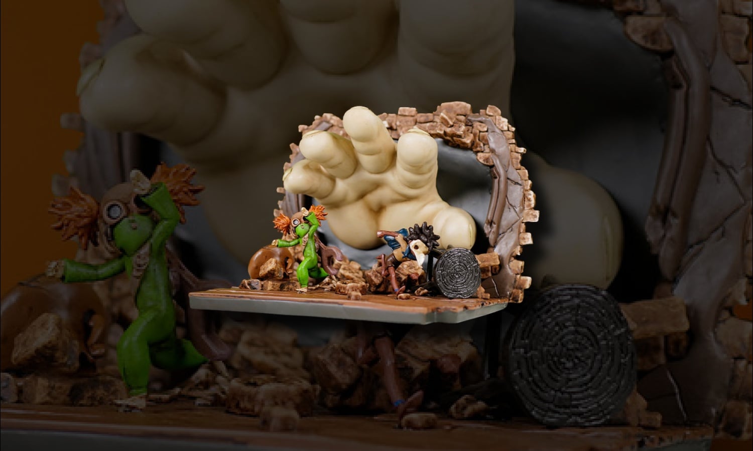 Le diorama restitue avec précision l’atmosphère de tension propre à cette séquence de jeu. Les détails sculptés illustrent la disproportion entre les deux petits personnages en fuite et la main démesurée qui cherche à les saisir, traduisant visuellement le sentiment de vulnérabilité caractéristique de la franchise. Le travail de peinture réalisé à la main confère à chaque exemplaire une finition unique, légèrement distincte d’une pièce à l’autre.