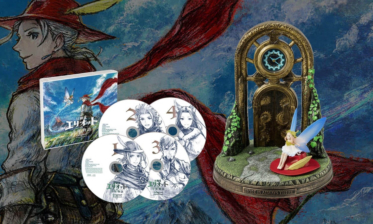 Le coffret comprend également la bande-son originale remasterisée de The Adventures of Elliot: The Millennium Tales, répartie sur 4 CD, chacun illustré par un personnage du jeu. Le boîtier présente une couverture aux couleurs de l’univers du titre.
