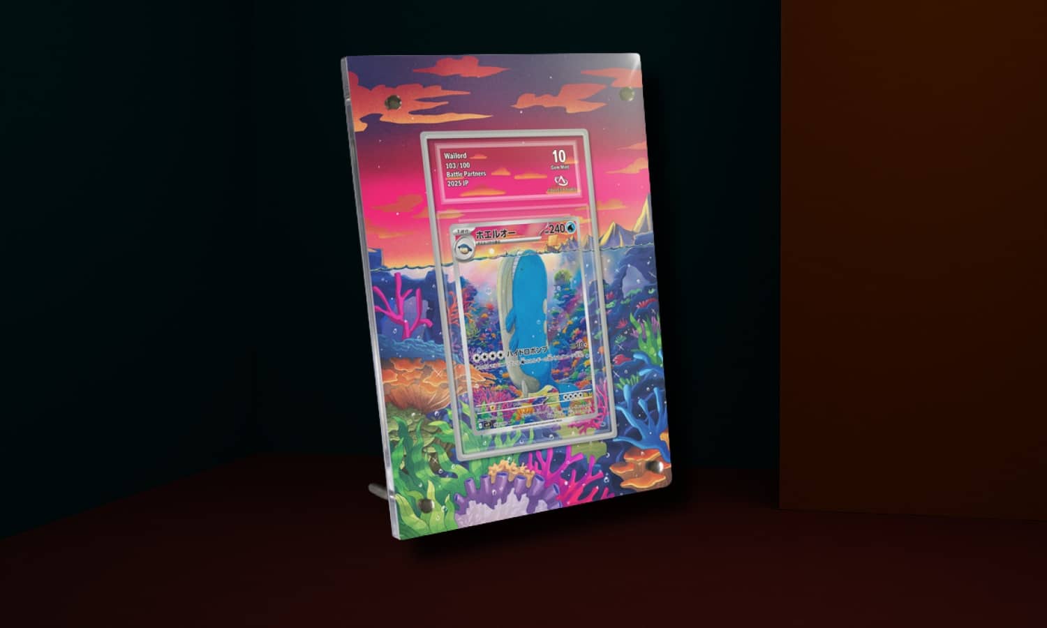 Cadre Carte Collectaura Wailord Battle Partners. Ce produit s’adresse aux collectionneurs et passionnés de cartes à collectionner appréciant les objets de présentation liés à l’univers des créatures de poche japonaises. Il est conçu pour protéger et mettre en valeur une carte à collectionner grâce à un écrin robuste et esthétique, adapté à différents environnements, qu’ils soient personnels ou professionnels. L’élément principal est une carte certifiée d’origine officielle, présentée dans un cadre pensé pour une conservation optimale.