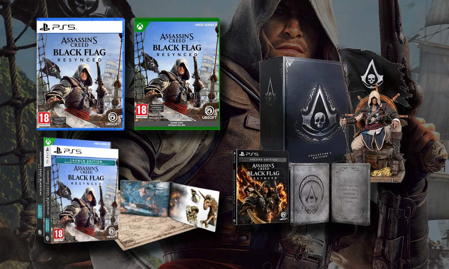 Disponible sur PS5, Xbox Series et PC au prix de 199,99 €, l’édition collector est la proposition la plus aboutie du lineup des versions physiques Assassin’s Creed Black Flac Resynced. Elle inclut :