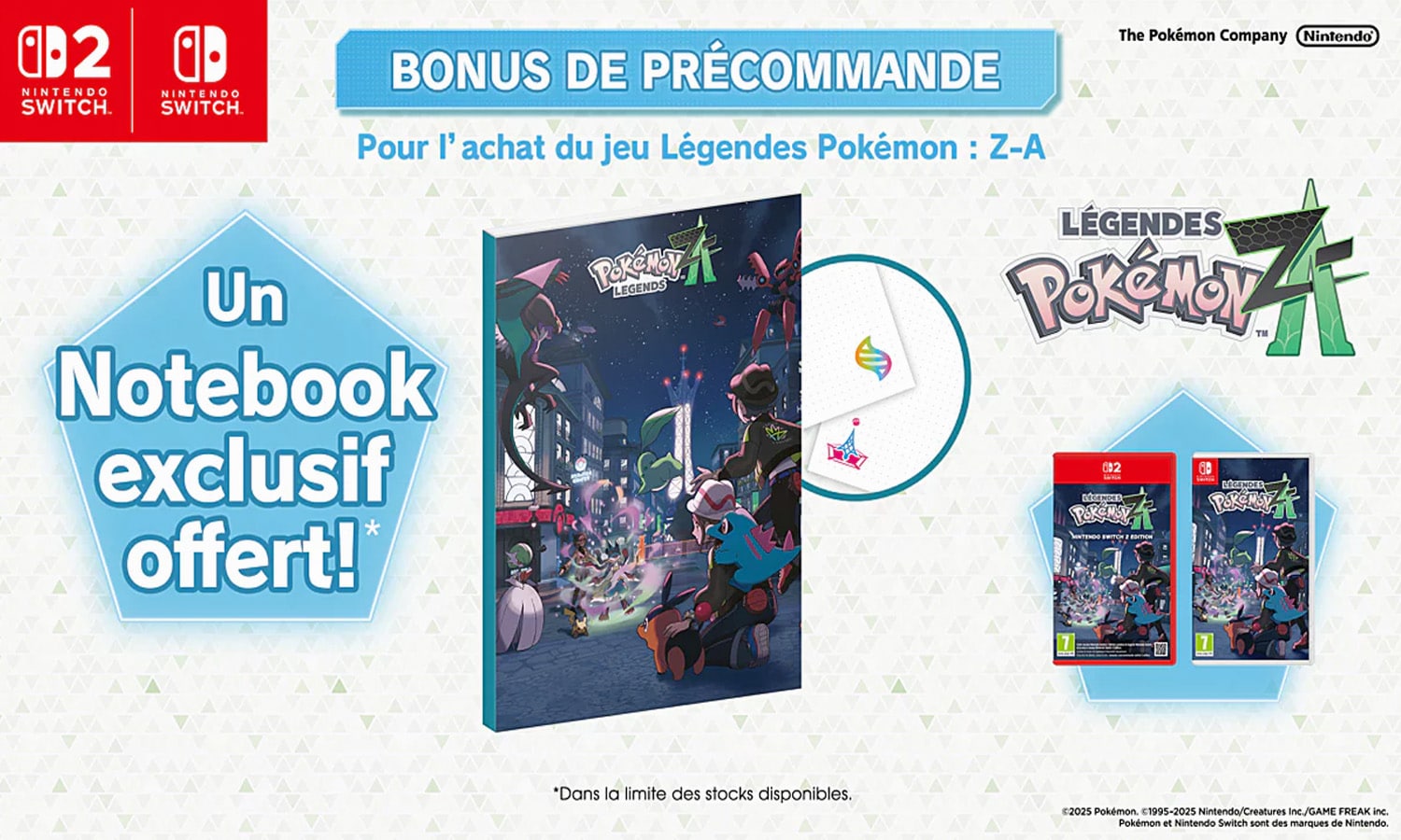 Cerise sur le gâteau ou Pokéball sur le Pikachu : E.Leclerc inclut un petit bonus pour les amateurs de papeterie geek. Chaque précommande du jeu permet de recevoir un notebook exclusif, dans la limite des stocks disponibles. Il s’agit d’un carnet aux couleurs de Légendes Pokémon Z-A, avec une couverture illustrée qui met en scène les deux protagonistes au cœur d’un environnement urbain nocturne. Parfait pour noter vos captures, dessiner votre starter favori ou, soyons réalistes, pour le laisser trôner fièrement sur votre étagère. A ressortir d’ici quelques années en souvenir de vos parties.