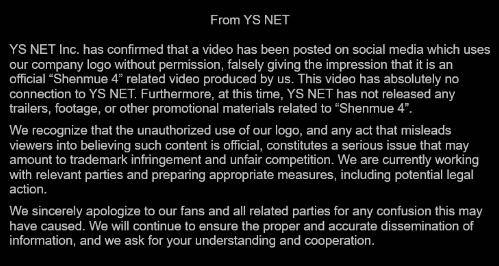 Face au raz-de-marée émotionnel que cette vidéo a déclenché, YS Net a dû sortir du silence. Le 8 décembre, le studio balance un communiqué sur X pour démentir formellement toute implication. “Cette vidéo n’a absolument aucun lien avec Ys Net”, précise le message, ajoutant que l’usage non autorisé du logo constitue une violation de leurs droits. En d’autres termes : c’est pas nous, c’est du fake, et on envisage des poursuites.